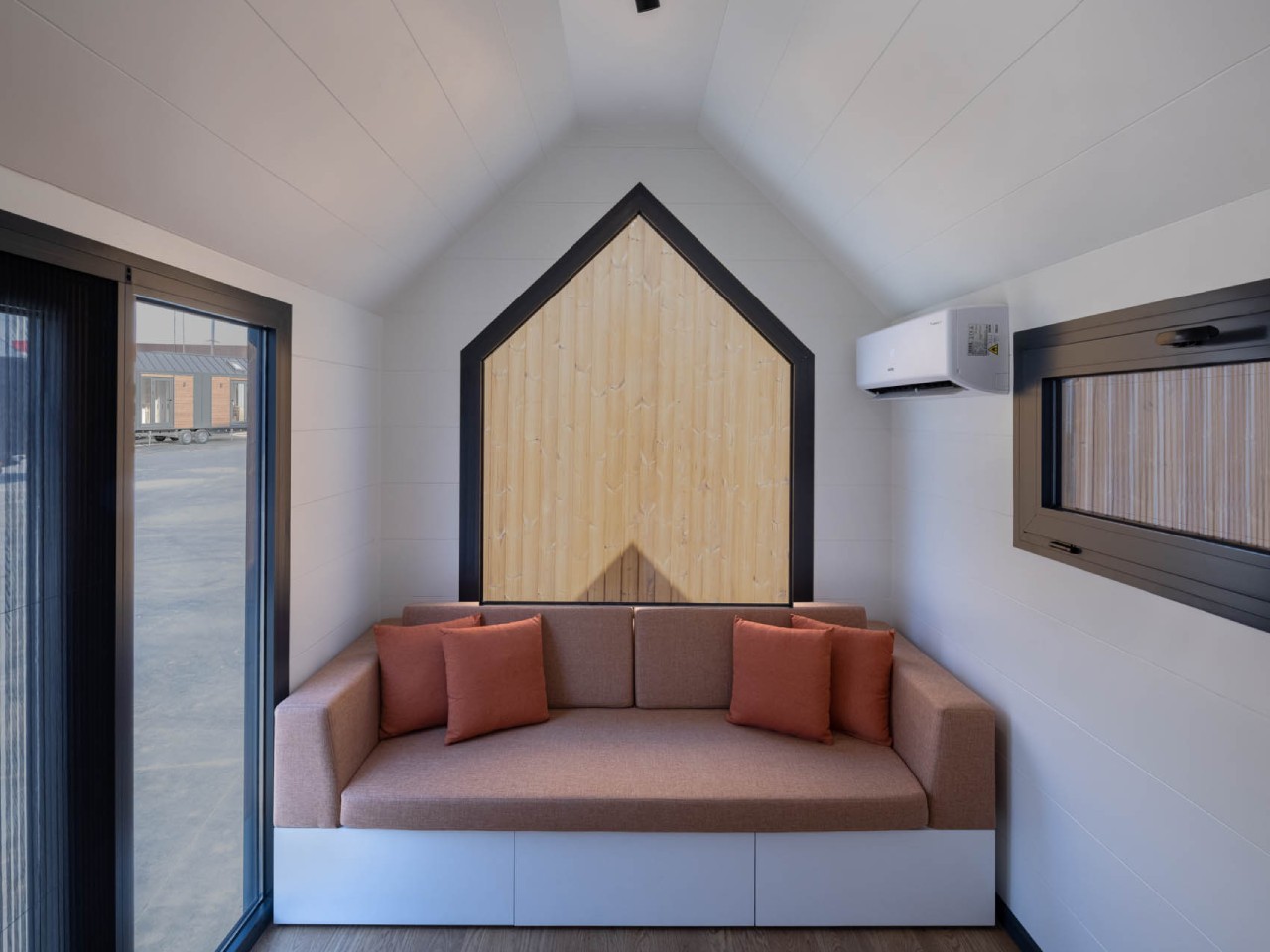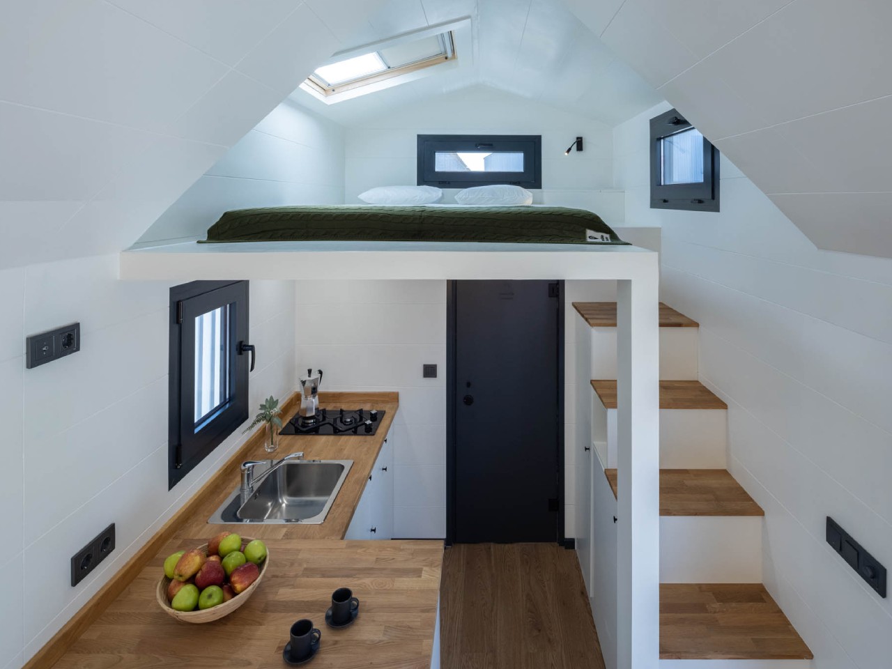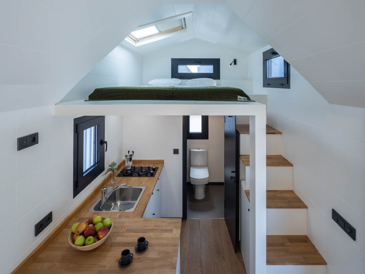 Mo.1 560 is a Mooble House model that combines living and sleeping areas with an ergonomic loft within a single volume.