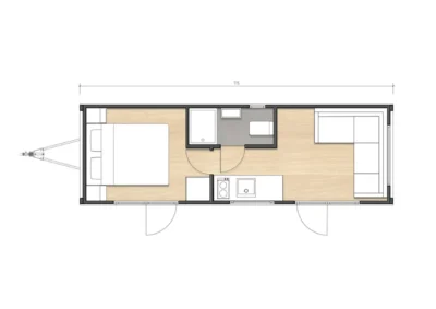 Mo.2 775 is the most optimal double room Mooble House model. Exterior cladding is predominantly metal on long sides and wood on narrow sides. The kitchen and bathroom, which are located in the center of the product, creates a corridor. The sleeping and living areas are separated from each other which makes this model the most efficient model for families with 4 people. This 7.75 meters long model is suitable for use by 4 people.
